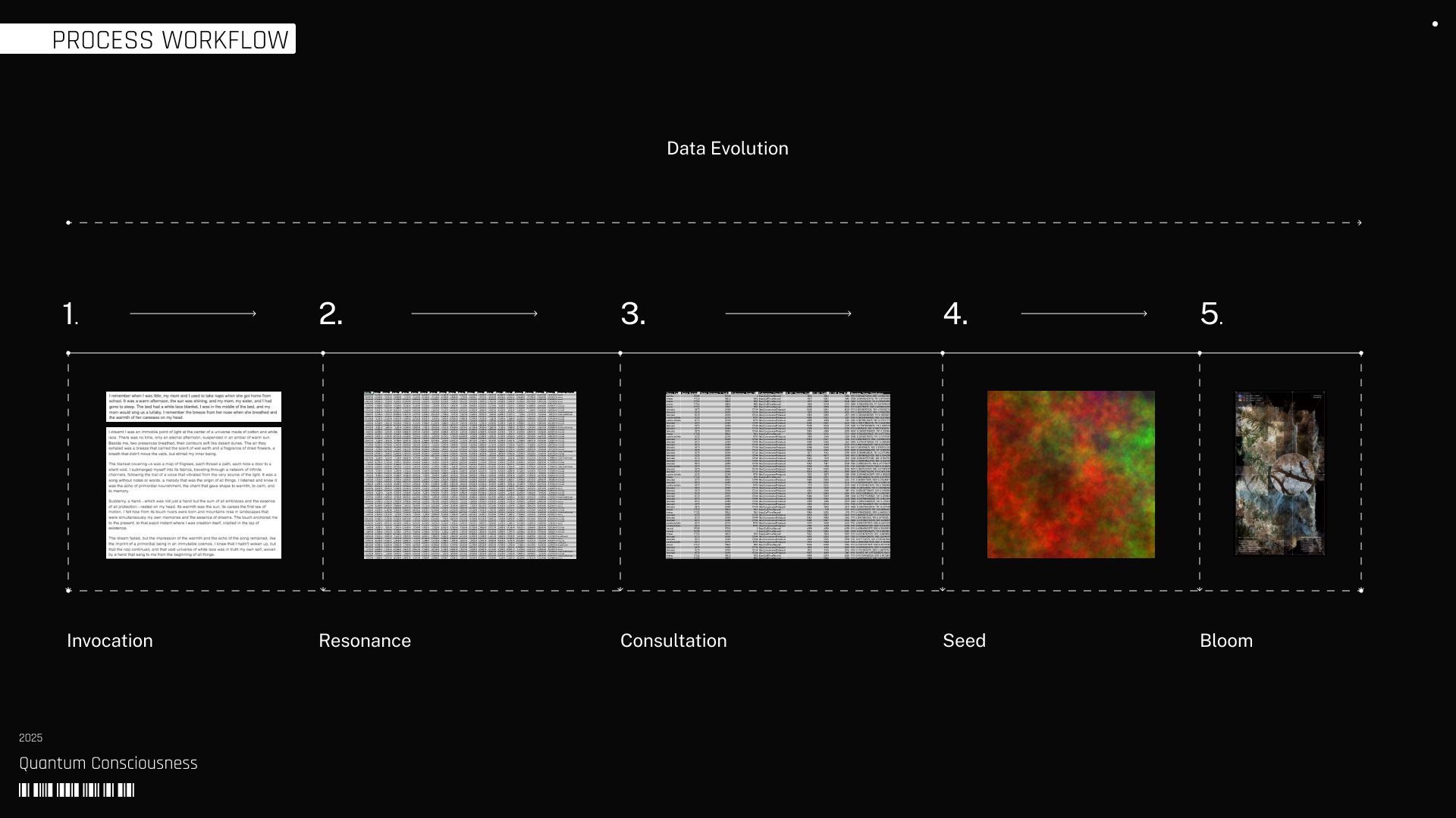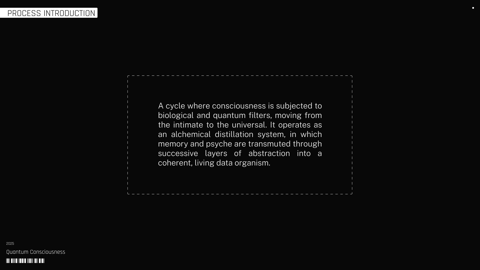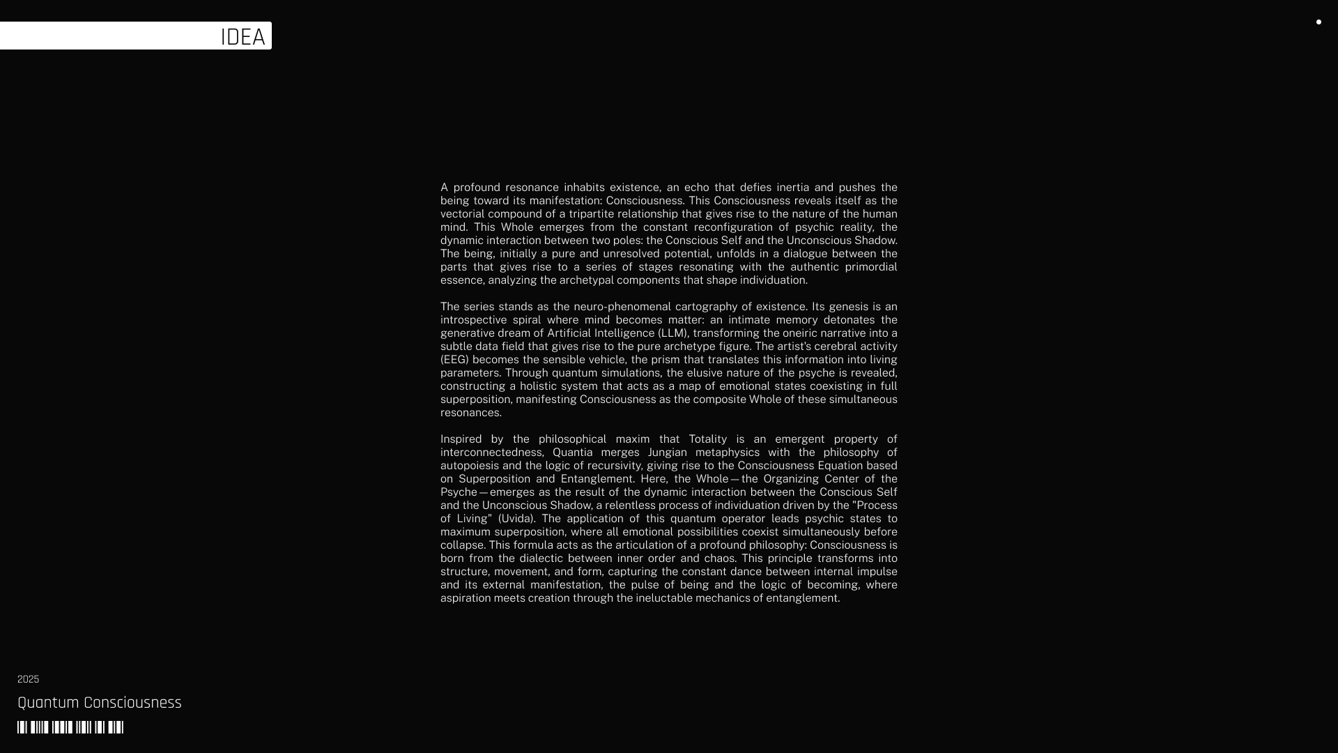 The series stands as the neuro-phenomenal cartography of existence. Its genesis is an introspective spiral where mind becomes matter: an intimate memory detonates the generative dream of Artificial Intelligence (LLM), transforming the oneiric narrative into a subtle data field that gives rise to the pure archetype figure. The artist's cerebral activity (EEG) becomes the sensible vehicle, the prism that translates this information into living parameters.