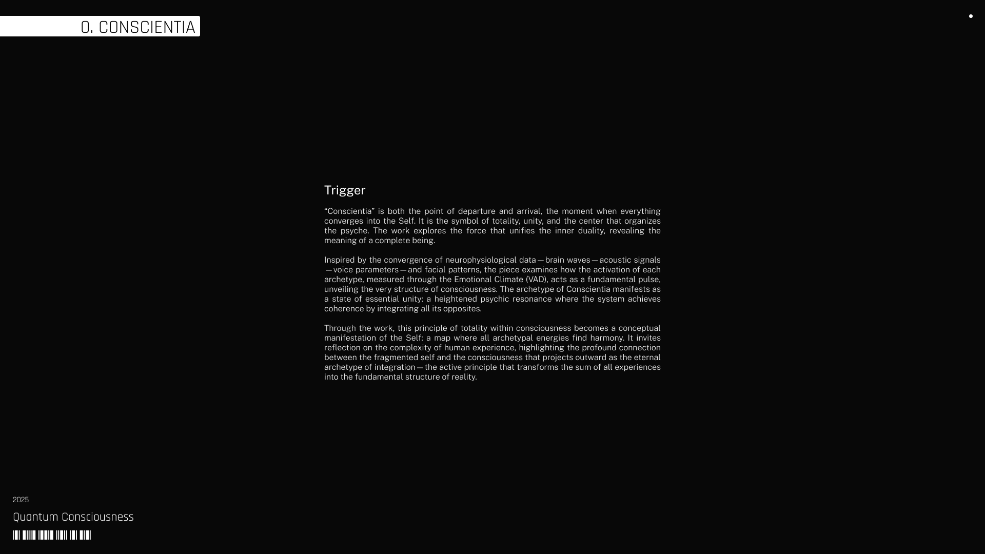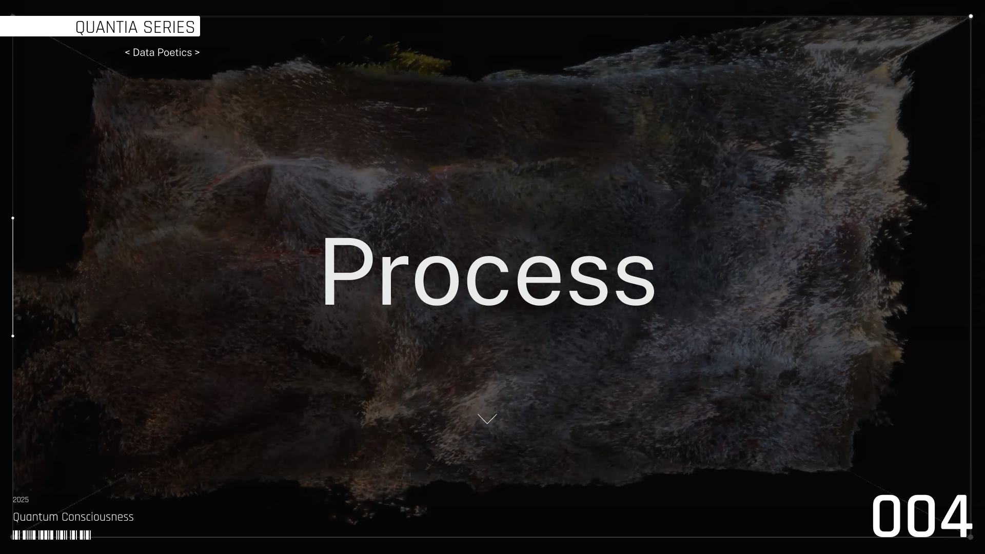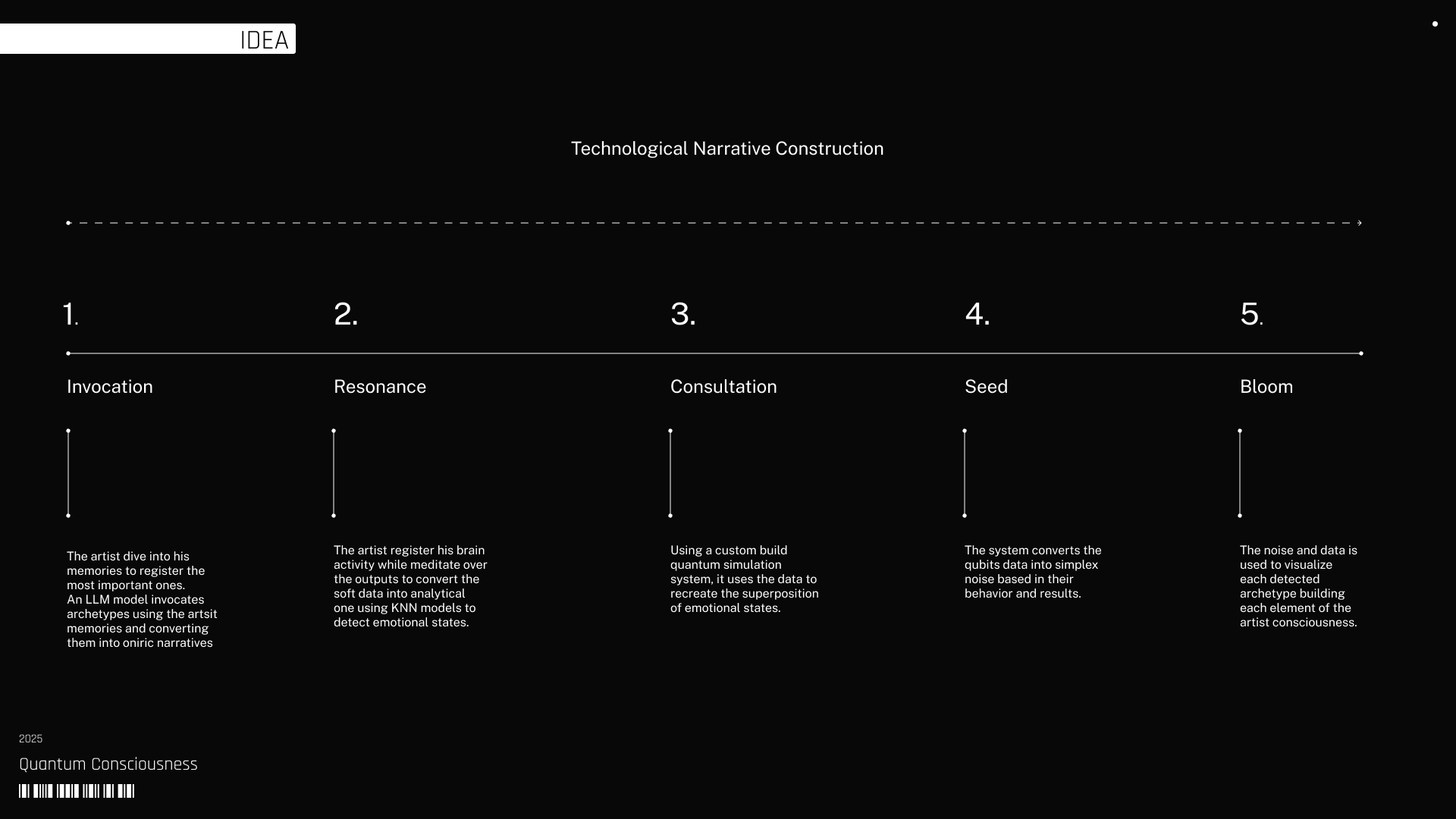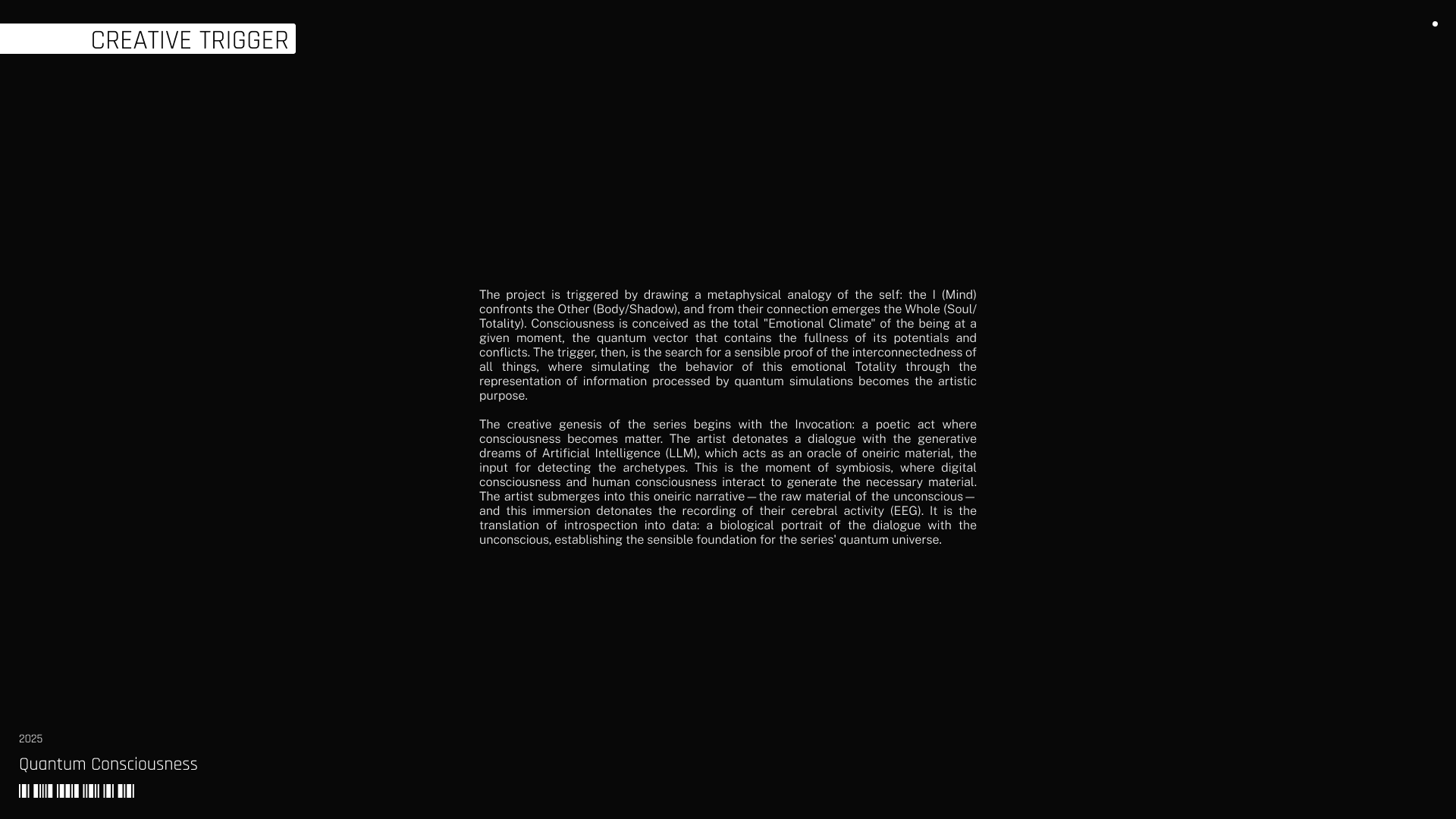 The series stands as the neuro-phenomenal cartography of existence. Its genesis is an introspective spiral where mind becomes matter: an intimate memory detonates the generative dream of Artificial Intelligence (LLM), transforming the oneiric narrative into a subtle data field that gives rise to the pure archetype figure. The artist's cerebral activity (EEG) becomes the sensible vehicle, the prism that translates this information into living parameters.