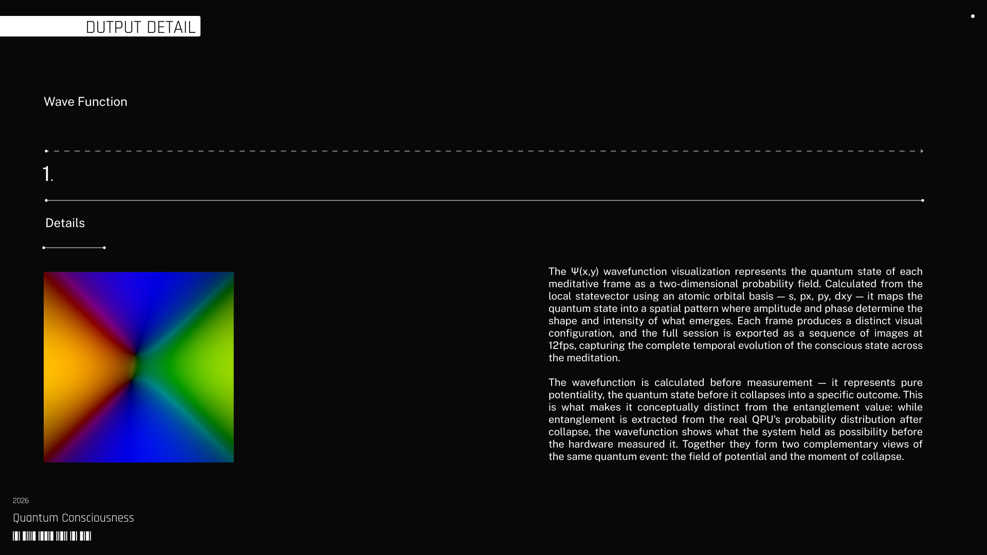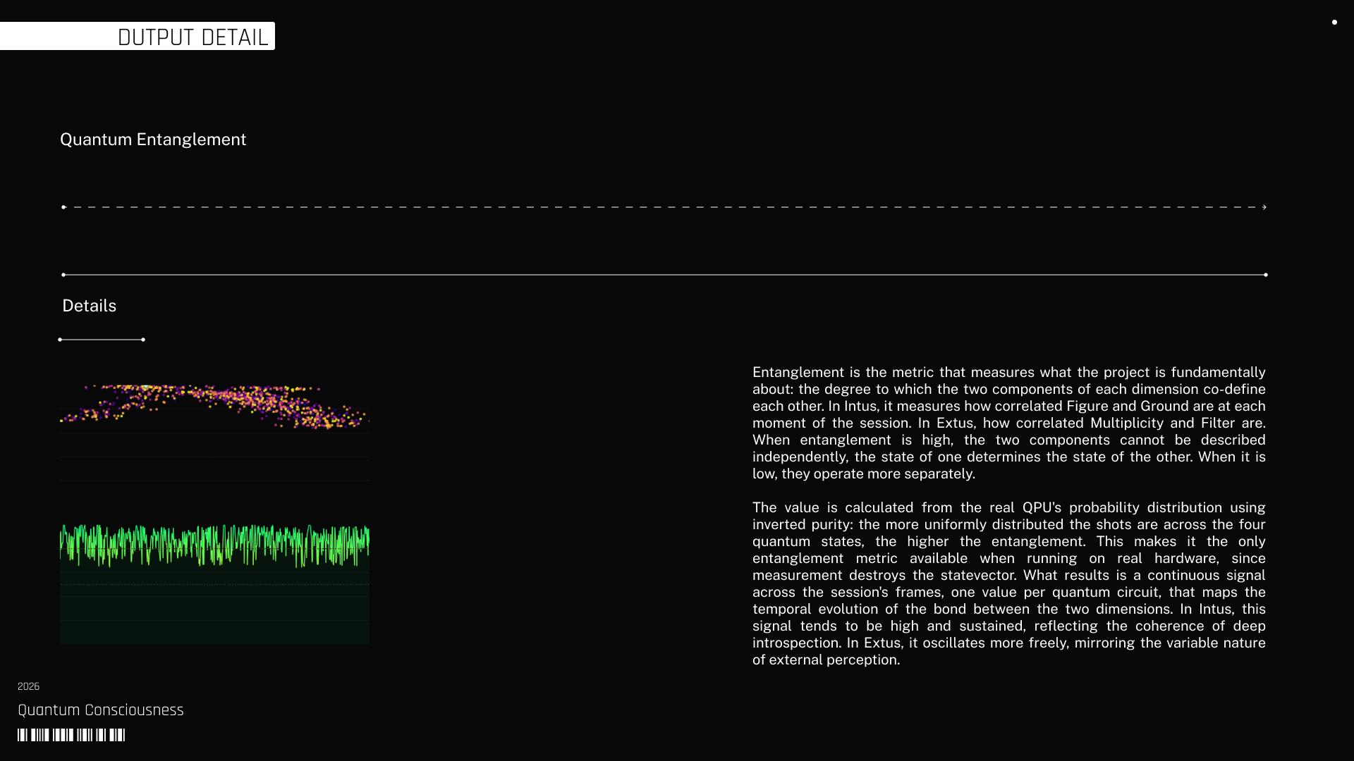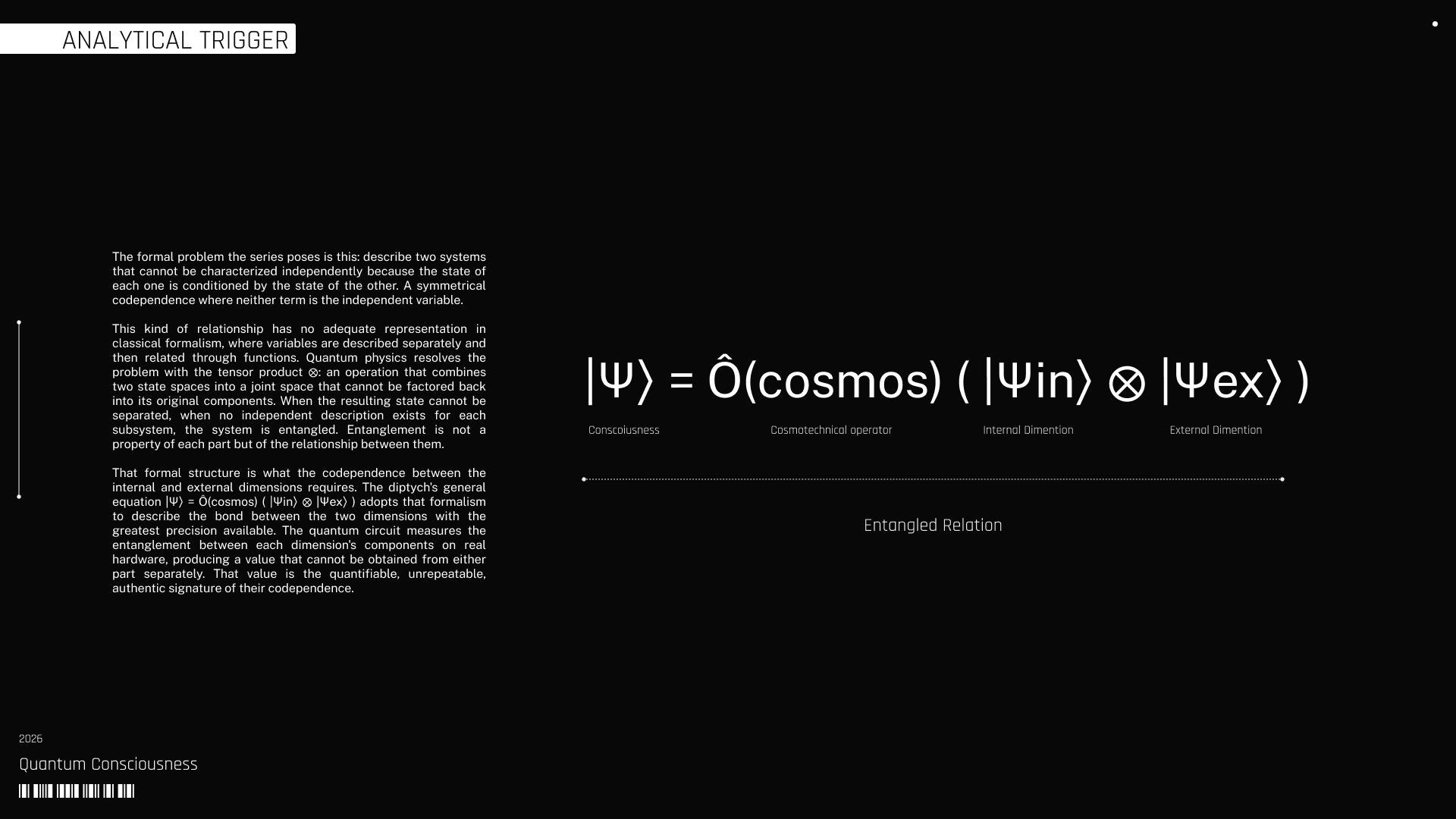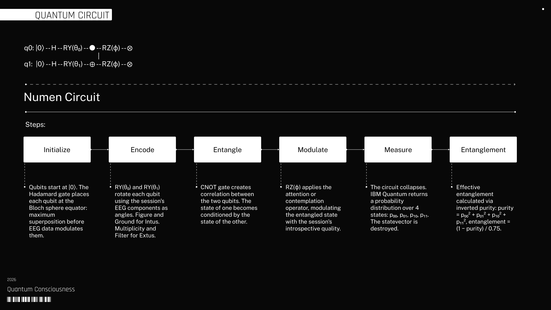 The work operates directly within that relation through a technical system that does not illustrate the process but instantiates it. EEG data captured during meditative states records the real activity of the nervous system as both orientations unfold. A custom AI engine processes this signal through sliding windows, normalization, and clustering, extracting the structural components that define each state. These components parameterize a 2-qubit quantum circuit executed on real Quantum hardware, where the relationship between them is encoded as entanglement. The system produces a distribution of states from which effective entanglement is calculated, embedding within each result the indeterminism and noise inherent to physical computation.