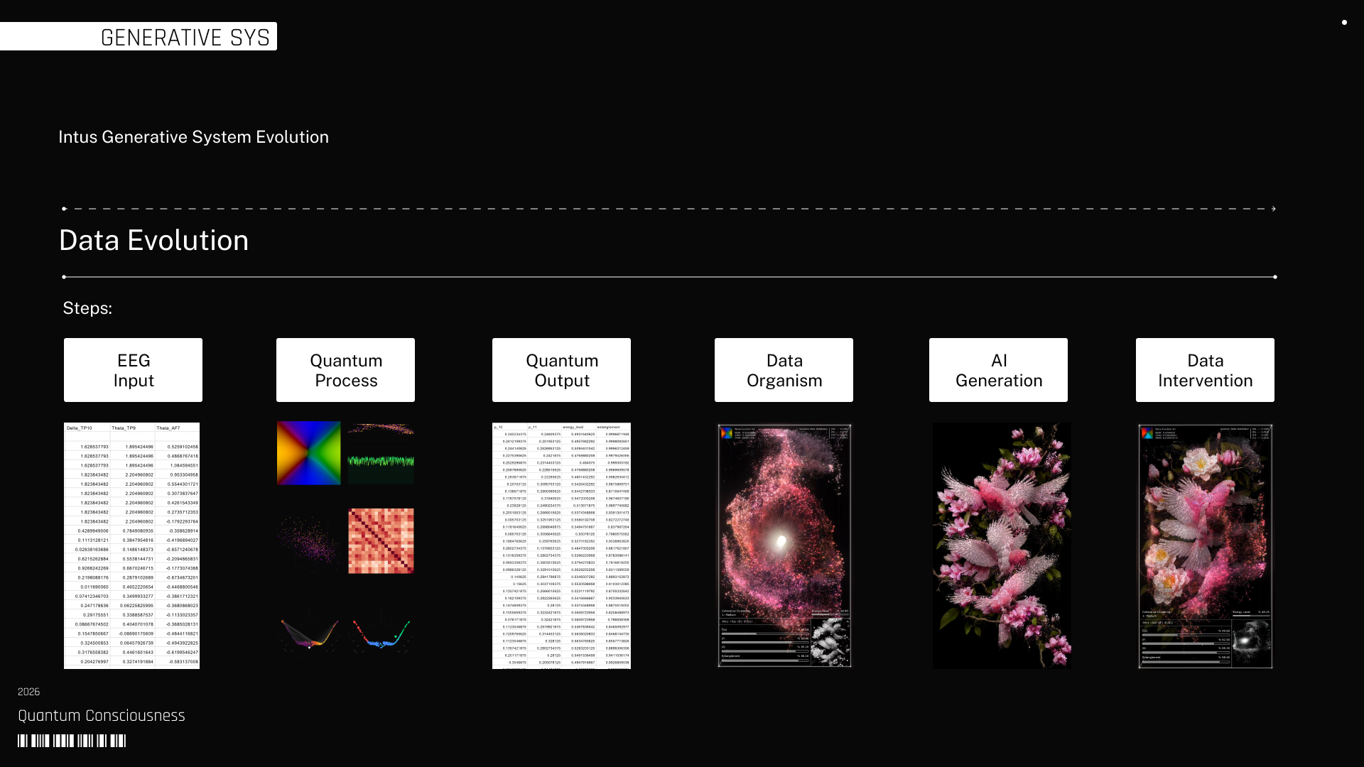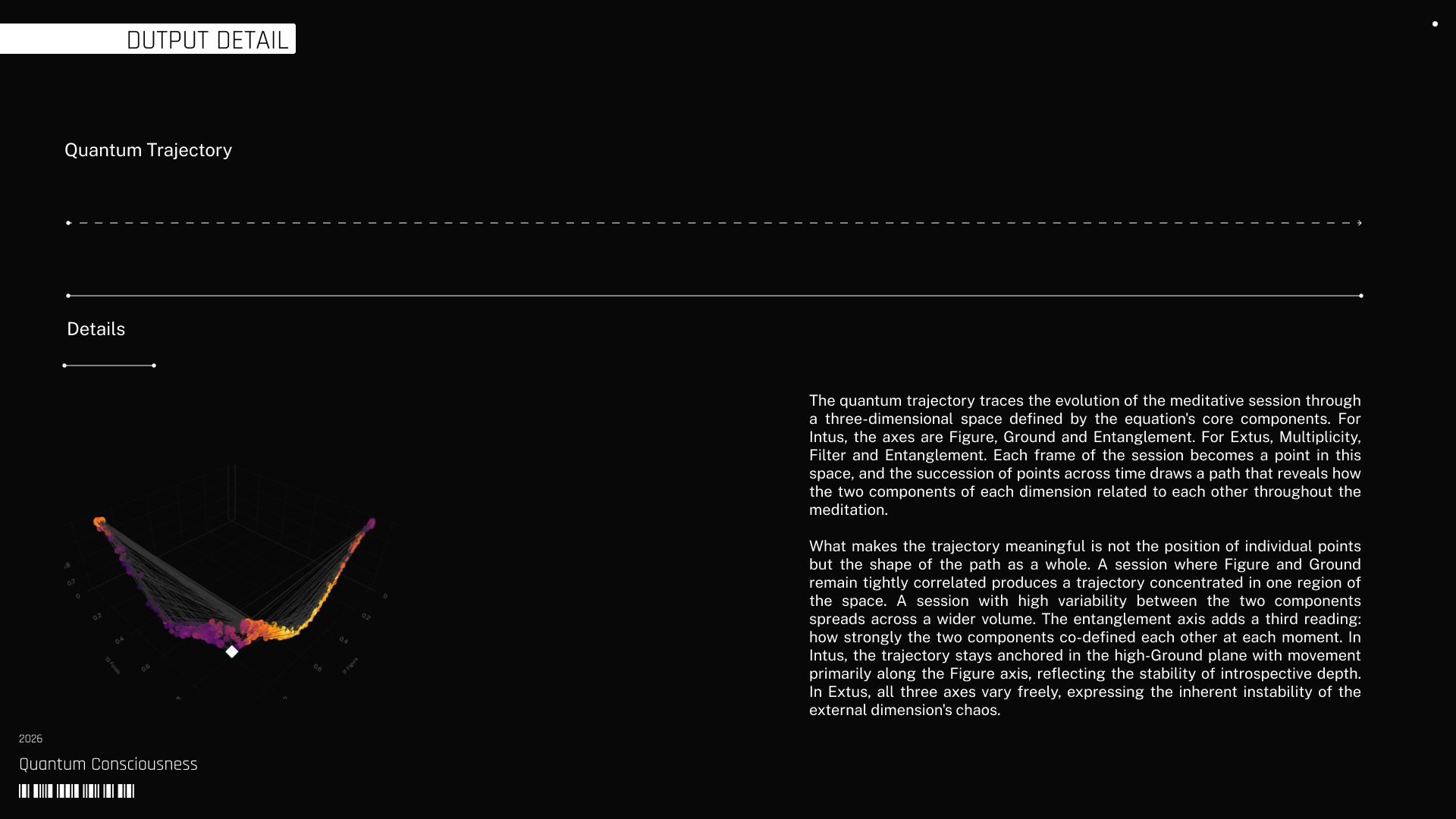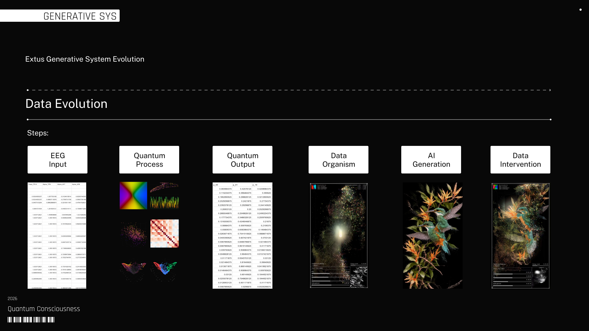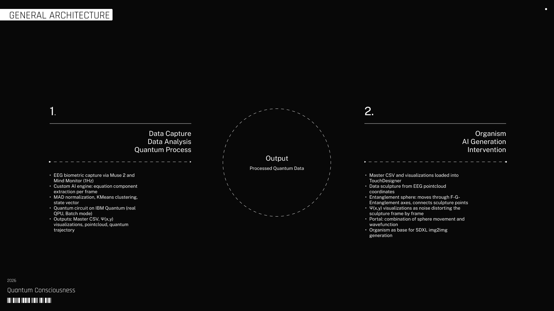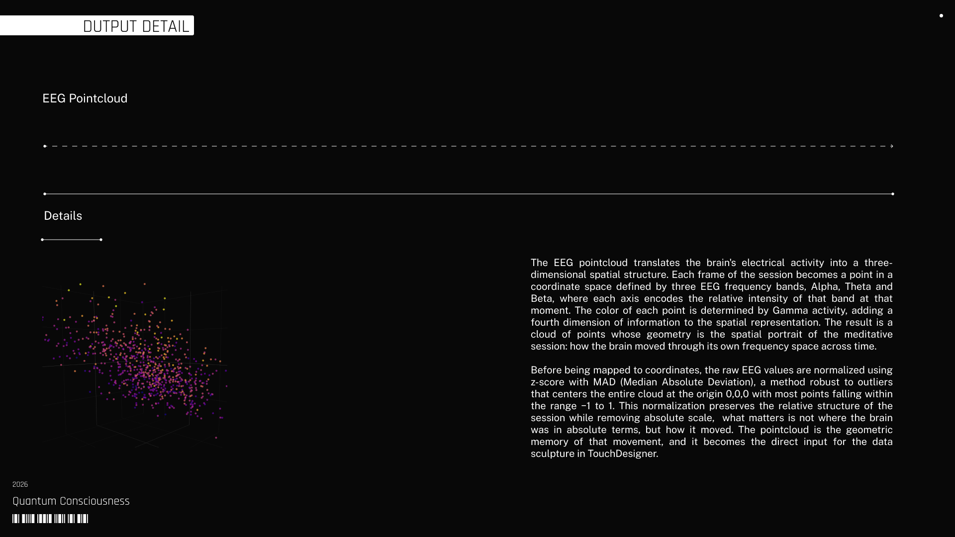 That output feeds a generative organism constructed in visual code software, where the quantum state takes spatial form as a dynamic pointcloud modulated in real time. The evolution of the system is expressed through trajectories, distortions, and correlations that remain tied to the underlying data. This structure becomes the substrate for generative AI models, which translate the organism into the final visual configuration. Each stage preserves the dependency between components, carrying forward the same condition across different layers of execution.