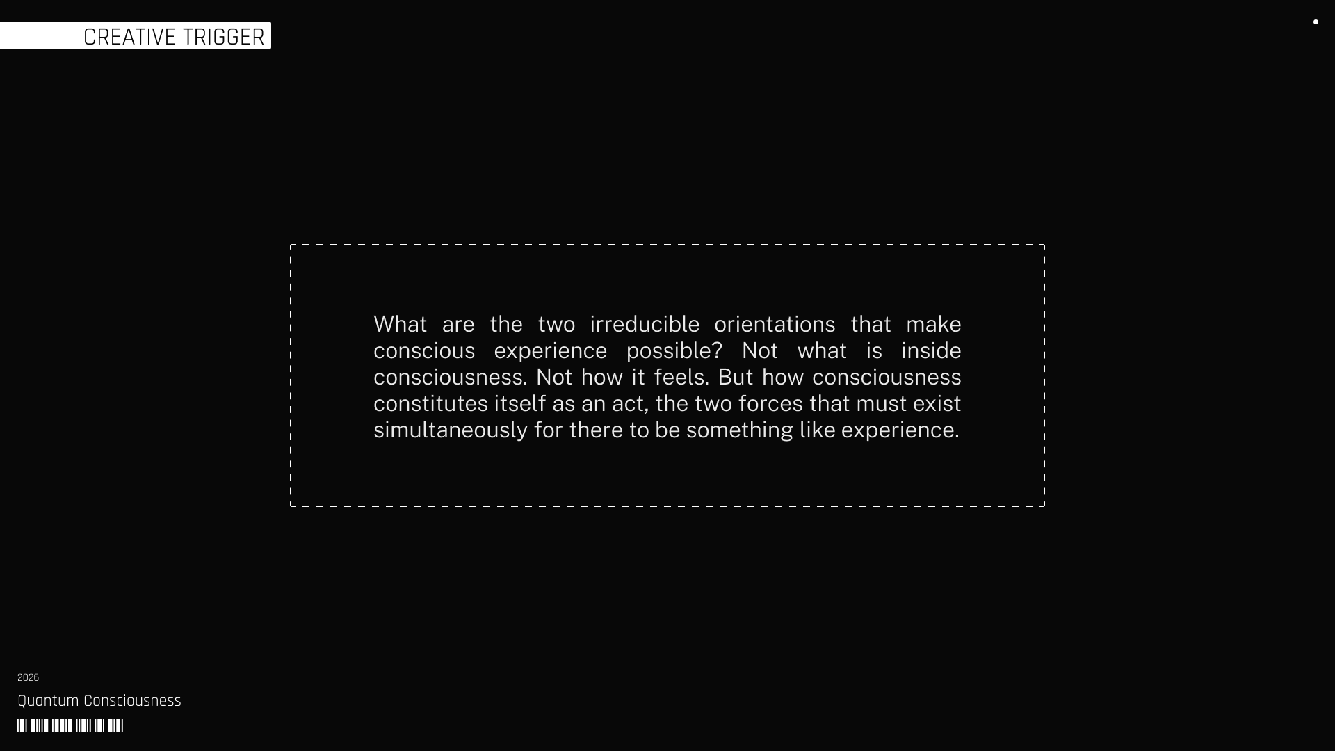 Numen emerges from a tension that cannot be resolved and, precisely because of that, sustains every act of consciousness. It begins in a split that cannot be separated: an inward orientation that organizes, filters, and stabilizes, and an outward orientation that exposes itself to multiplicity before it is structured. These two movements occur simultaneously, each carrying the other as the condition of its own existence. Conscious experience persists within that bond as a dynamic equilibrium that never settles, continuously reconfiguring itself through the interplay between order and chaos.